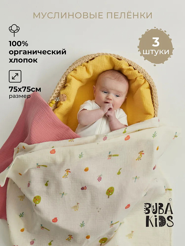 Пелёнки муслиновые Buba Kids, 3 шт, 75х75 см BKMUSSW49 Сады Кавказа/ горчица/ малина со сливкамиНет оценокХарактеристики