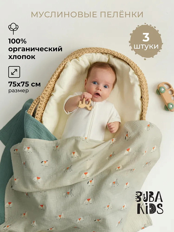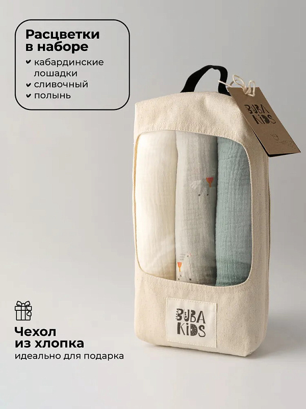 Пелёнки муслиновые Buba Kids, 3 шт, 75х75 см BKMUSSW50 Кабардинские лошадки/ полынь/ сливочныйНет оценокХарактеристики
