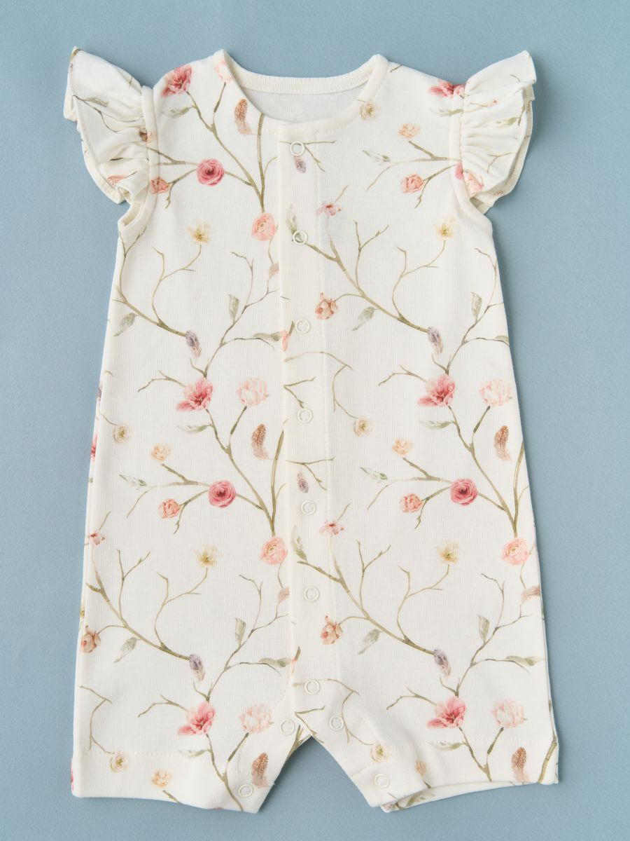Стильный песочник для девочки с очаровательным принтом “Цветочки на веточках” - воплощение комфорта и нежности для вашего ребенка.