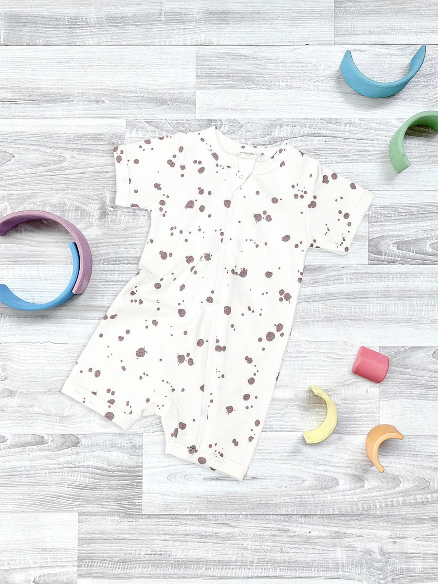 Песочник Mjölk [мьёльк] Sleep and Play Кляксы – это комбинезон на молнии с короткими рукавами и штанинами, выполненный из плотного и очень мягкого трикотажа.