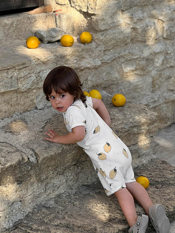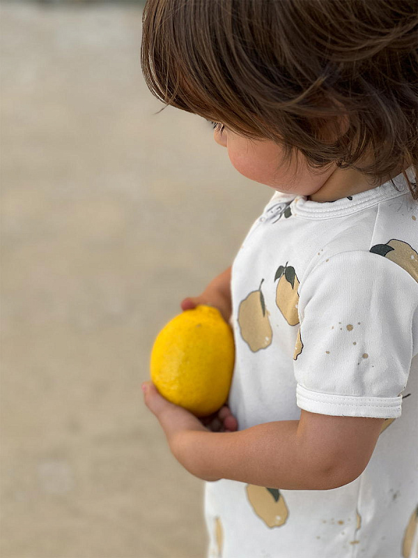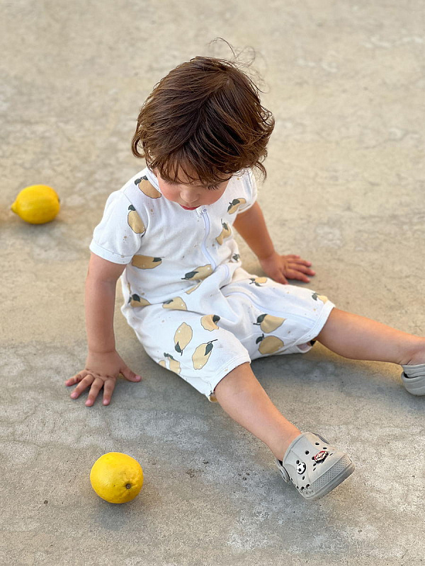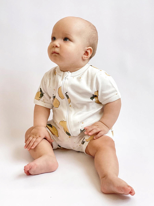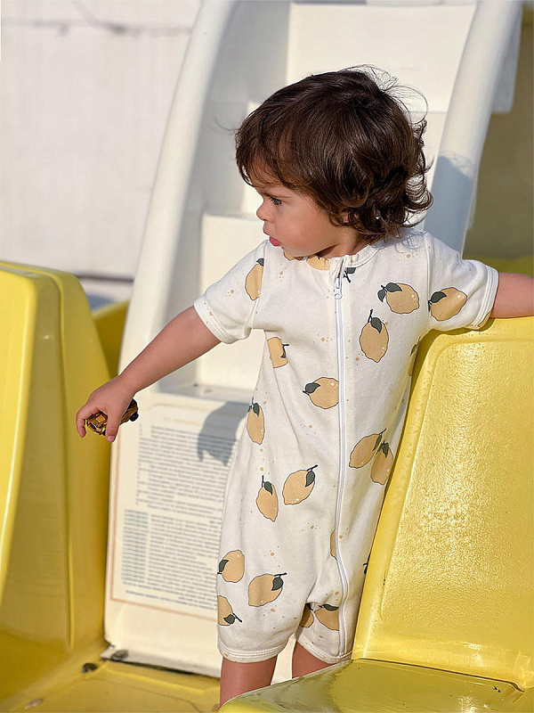 Песочник Mjölk [мьёльк] Sleep and Play Лимоны – это комбинезон на молнии с короткими рукавами и штанинами, выполненный из плотного и очень мягкого трикотажа.
