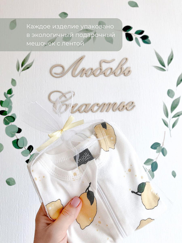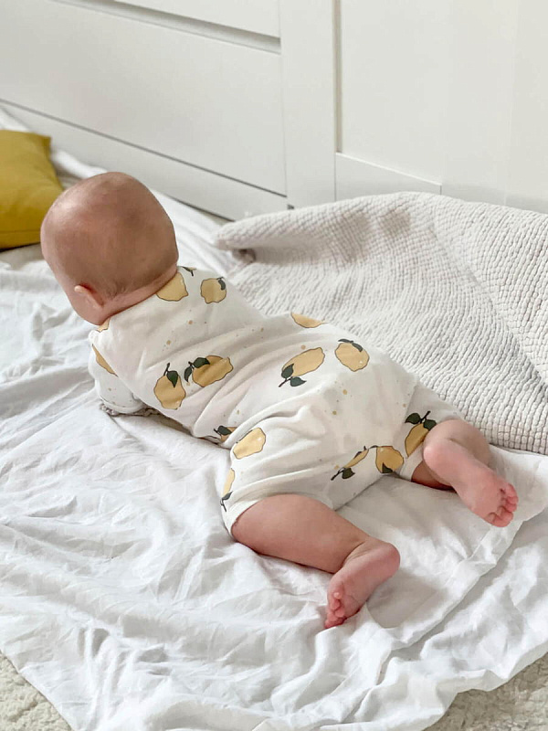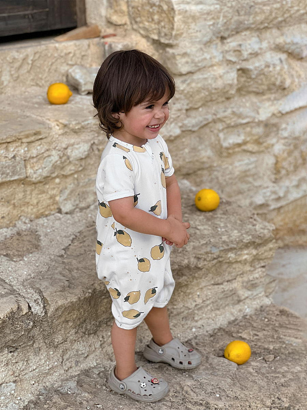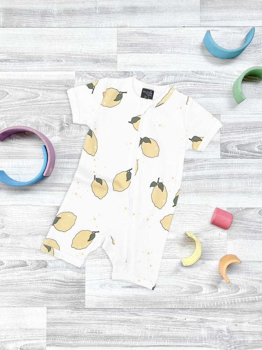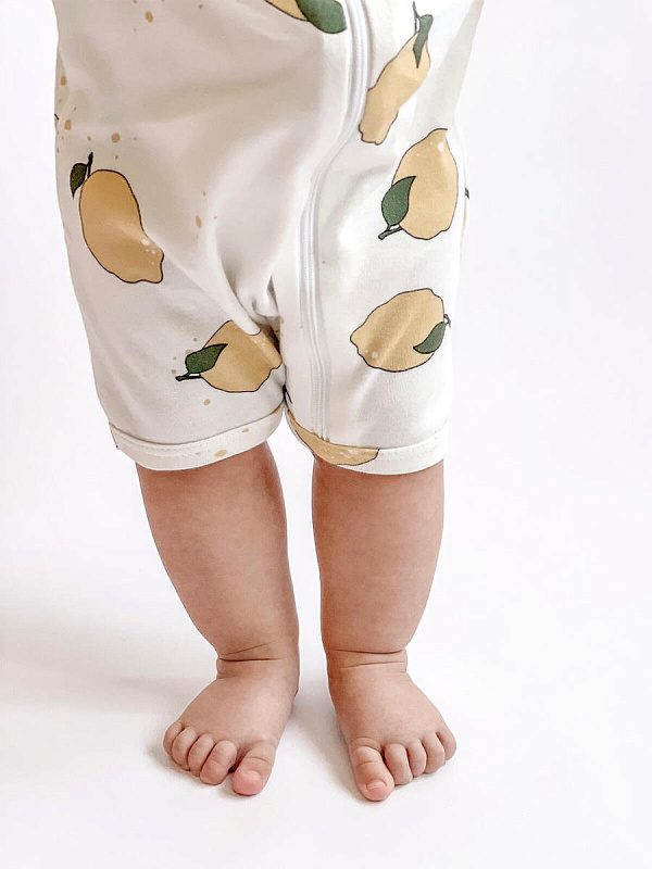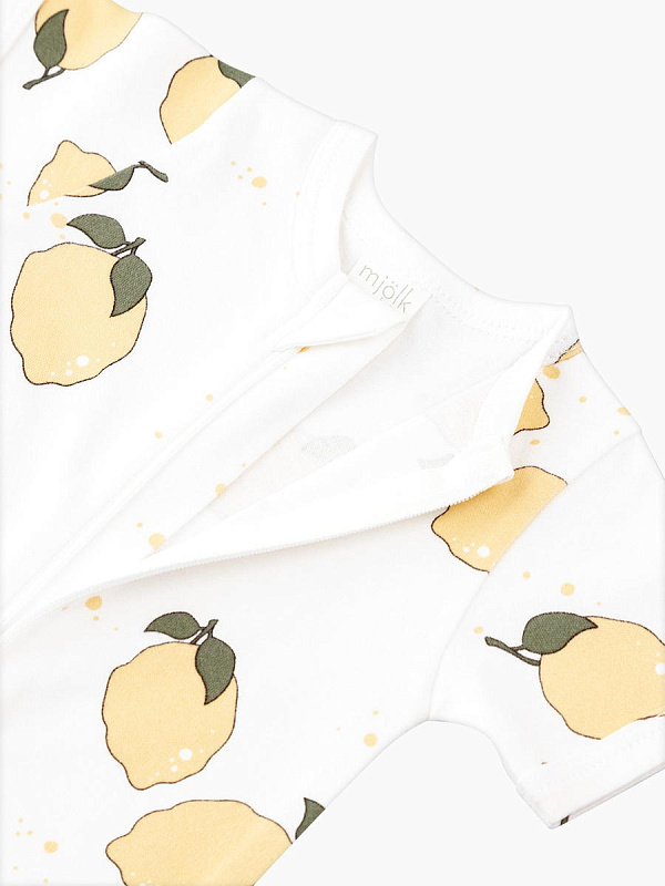 Песочник Mjölk [мьёльк] Sleep and Play Лимоны – это комбинезон на молнии с короткими рукавами и штанинами, выполненный из плотного и очень мягкого трикотажа.
