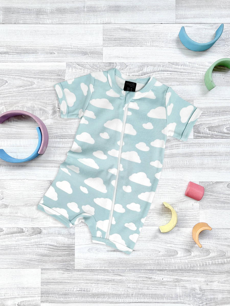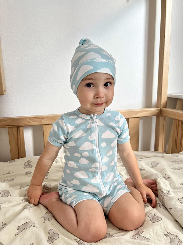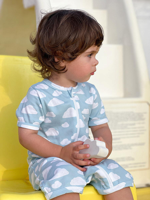 Песочник Mjölk [мьёльк] Sleep and Play Облака – это комбинезон на молнии с короткими рукавами и штанинами, выполненный из плотного и очень мягкого трикотажа.