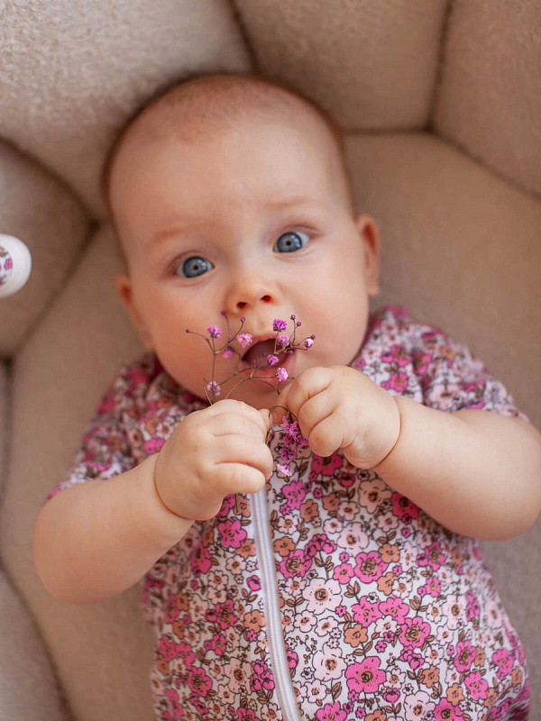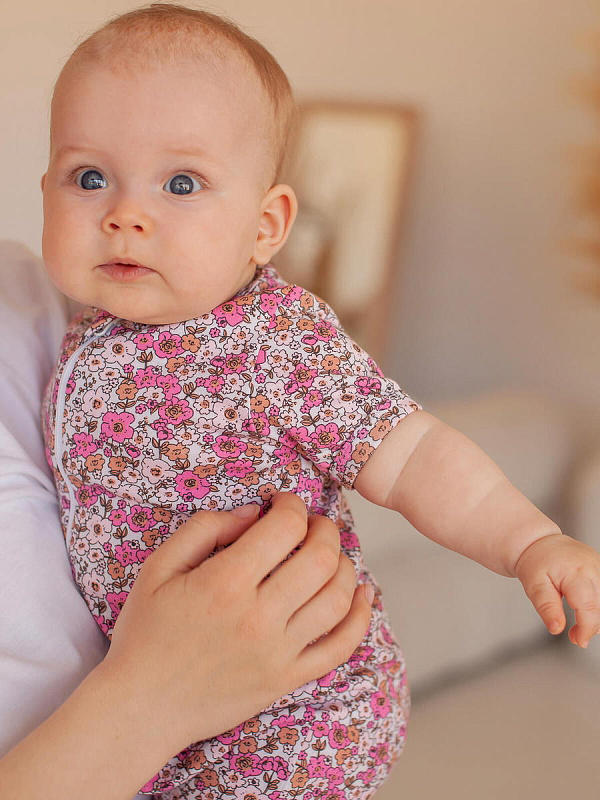 Песочник Mjölk [мьёльк] Sleep and Play Bloom – это комбинезон на молнии с короткими рукавами и штанинами, выполненный из плотного и очень мягкого трикотажа.