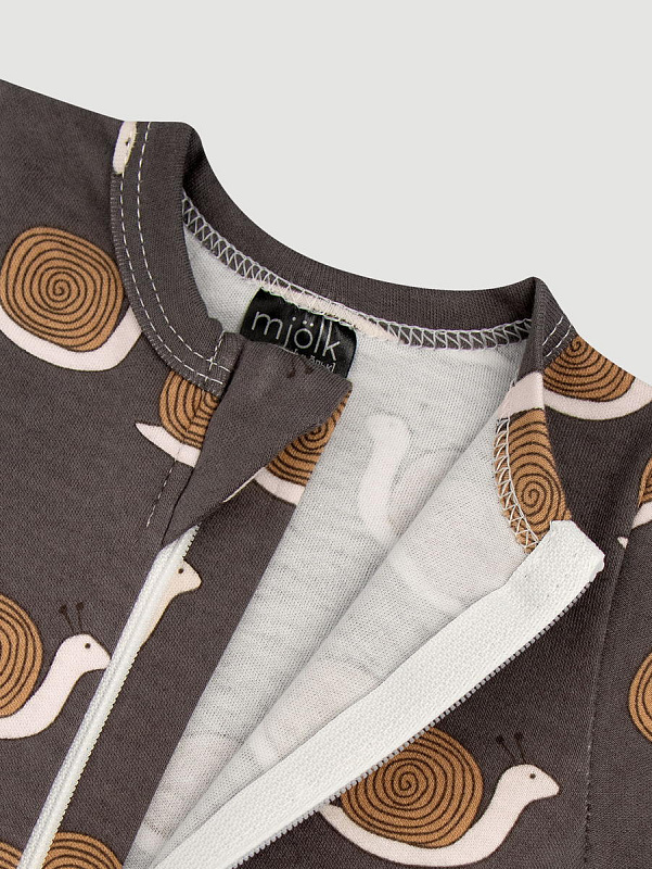 Песочник Mjölk [мьёльк] Sleep and Play Улитки – это комбинезон на молнии с короткими рукавами и штанинами, выполненный из плотного и очень мягкого трикотажа.