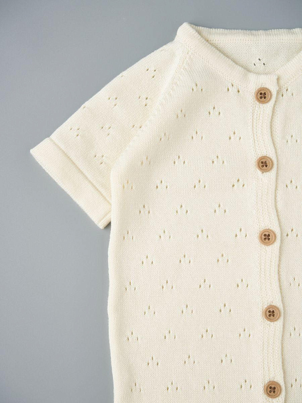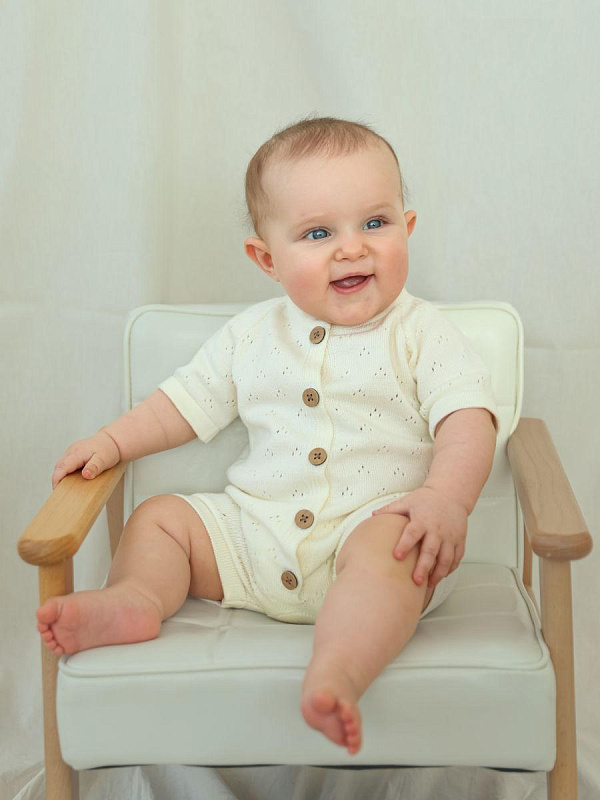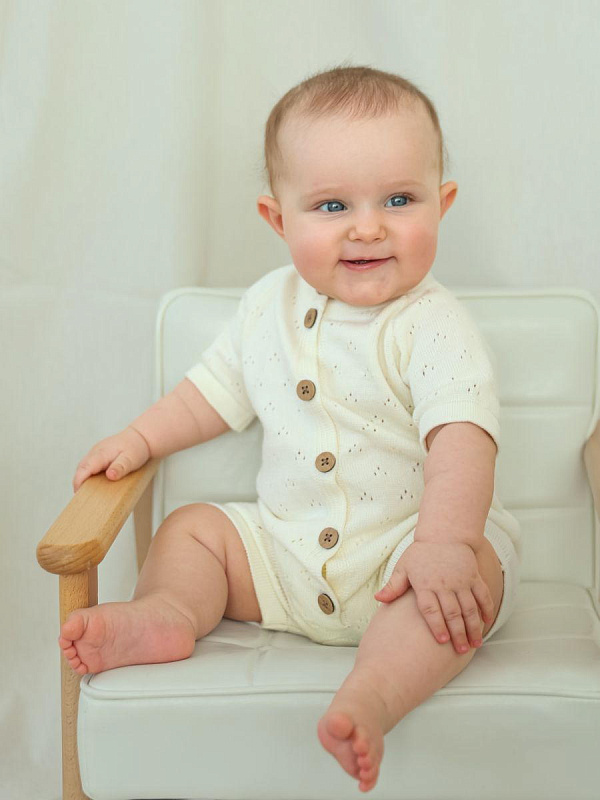 Песочник выполнен из мягкого вязаного трикотажа. Удобная модель, позволит легко и быстро переодевать малыша. Пуговицы расположены по центру, сверху донизу.