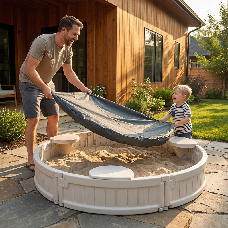Особого внимания заслуживает защитный тент из прочного полиэстера с усиленной резинкой по периметру. Тент эффективно защищает внутреннее пространство песочницы от влаги, пыли и солнца.