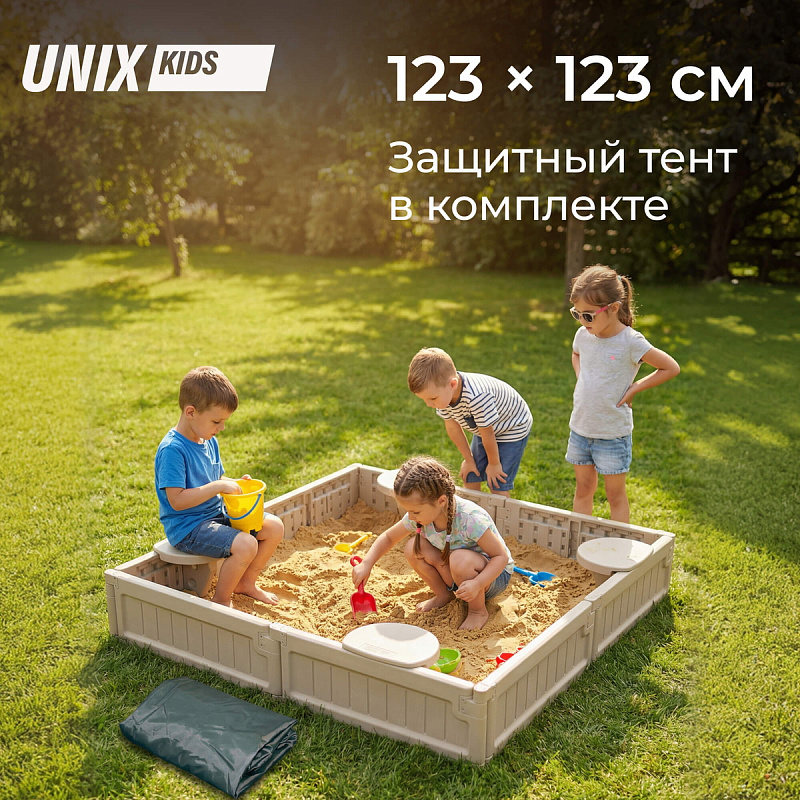 Детская квадратная песочница с защитным чехлом UNIX Kids для улицы и дома – это увлекательное и функциональное игровое пространство, идеально подходящее для активного отдыха детей дошкольного возраста. Она выполнена в форме квадрата 123 х 123 см и оснащена 4-мя удобными сиденьями для комфортного размещения детей во время игры. Каждое сиденье рассчитано на нагрузку до 25 кг. Максимальная вместительность составляет до 270 кг песка (около 180 литров), что позволяет создать обширную зону для творчества и развлечений.