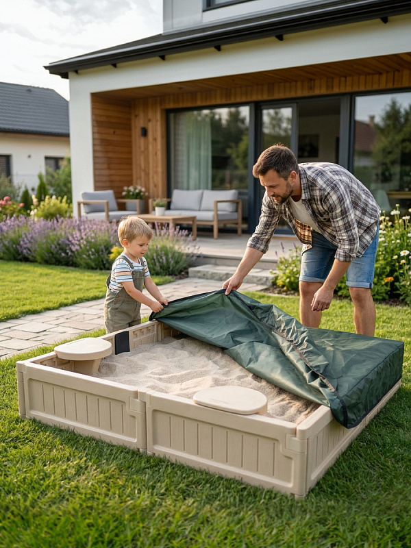 Особого внимания заслуживает защитный тент из прочного полиэстера с усиленной резинкой по периметру. Тент эффективно защищает внутреннее пространство песочницы от влаги, пыли и солнца.