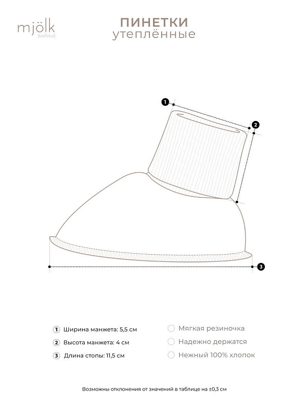 Пинетки Mjölk подарят крохе не только тепло, но и милый образ для дома, прогулок и фотосессий. Изделия упакованы в нарядный фатиновый мешочек и станут полезным подарком к появлению на свет крошки. Пинетки изготовлены из интерлока – плотного, лёгкого и приятного на ощупь трикотажа. Материал не вызывает аллергии, пропускает воздух, защищает от перегрева и охлаждения.