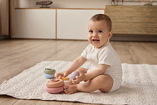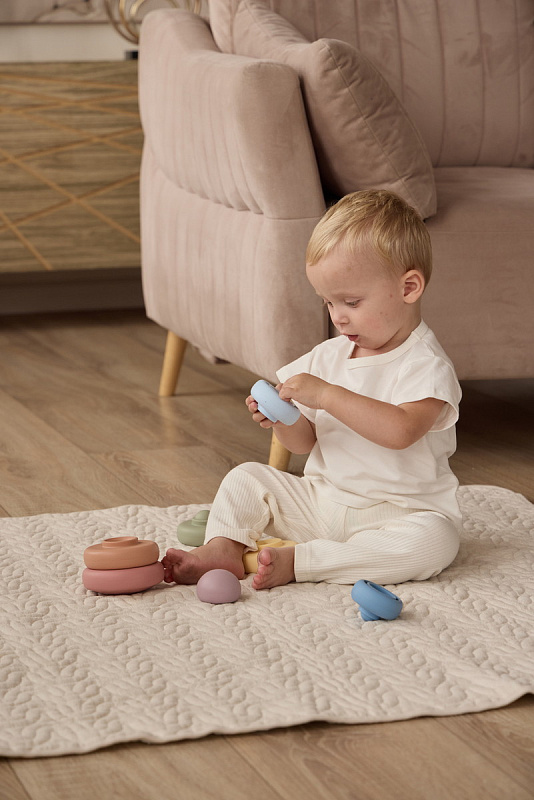 - Развивающая игрушка — игры с пирамидкой укрепляют мелкую моторику и стимулируют развитие мышления и логики.