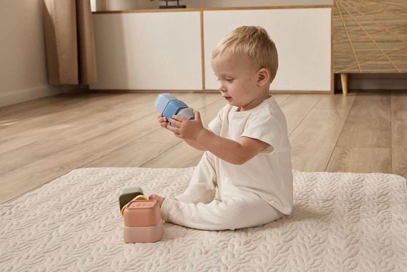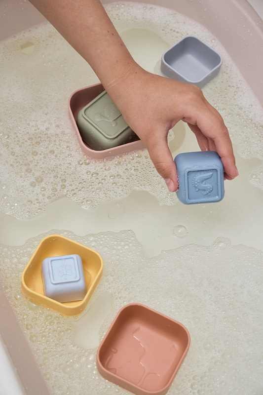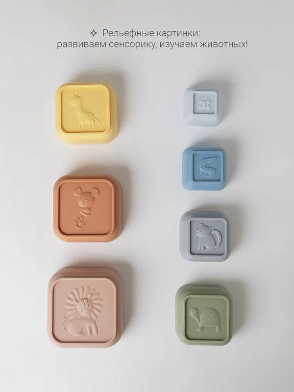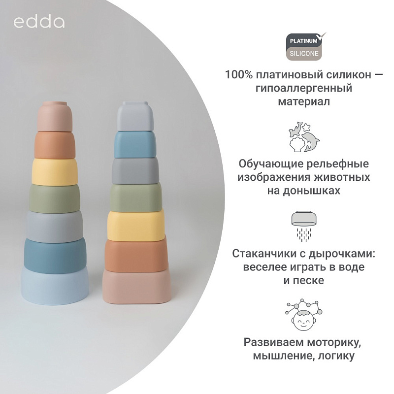 Набор edda состоит из семи стаканчиков разной формы, которые ребёнок может собирать в яркую пирамидку, развивая логику и моторику. Малыш знакомится с понятиями «больше-меньше», каждый стаканчик можно использовать отдельно для творческих игр с песком и водой. В коллекции — два дизайна: круглые стаканчики с морскими обитателями и квадратные с забавными зверятами на рельефном донышке. Оба набора выполнены из платинового силикона пастельных оттенков — безопасного, практичного и приятного на ощупь.