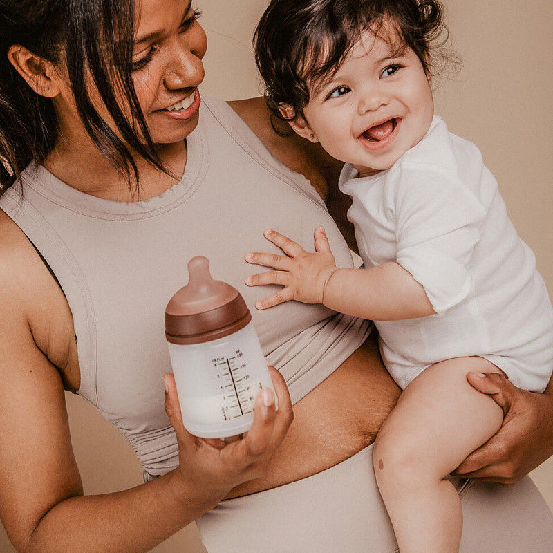 Бутылочка оснащена уникальным антиколиковым силиконовым мешочком, который сжимается в процессе кормления, предотвращая попадание лишнего воздуха и создавая физилогичное давление при сосании, схожее с материнской грудью. Этот механизм позволяет снизить возникновение коликов, а также риск дискомфорта и неприятных ощущений после еды.