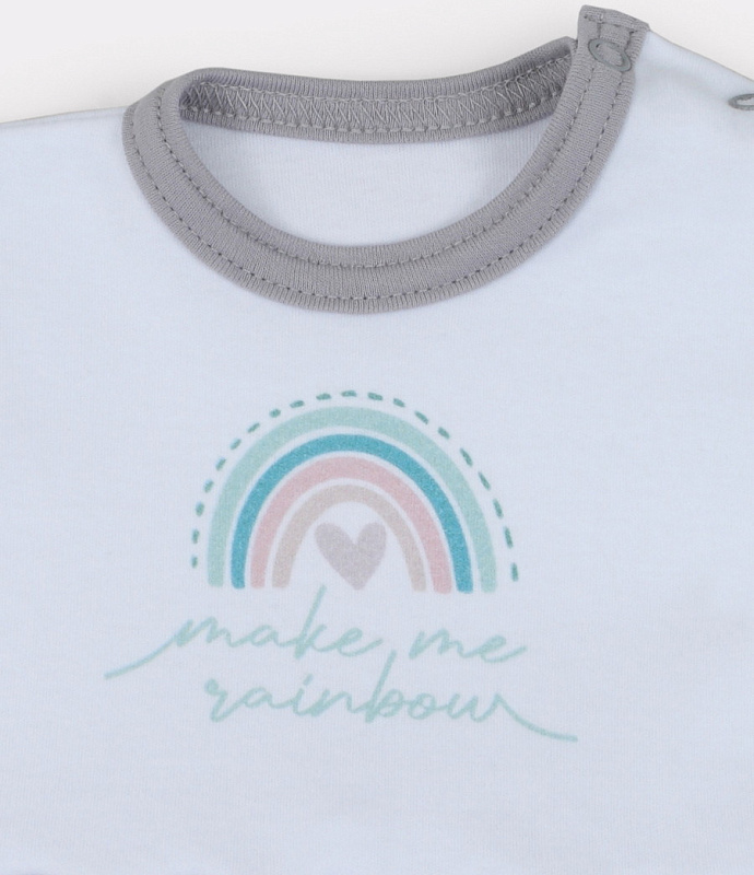 Лимитированная коллекция Rainbow выполнена с учетом физиологических особенностей малыша. Спокойный принт в пастельных тонах, лаконичный дизайн, комфортное лекало, цветная окантовка, качественная фурнитура в тон и хлопок премиум-класса (интерлок-пенье).