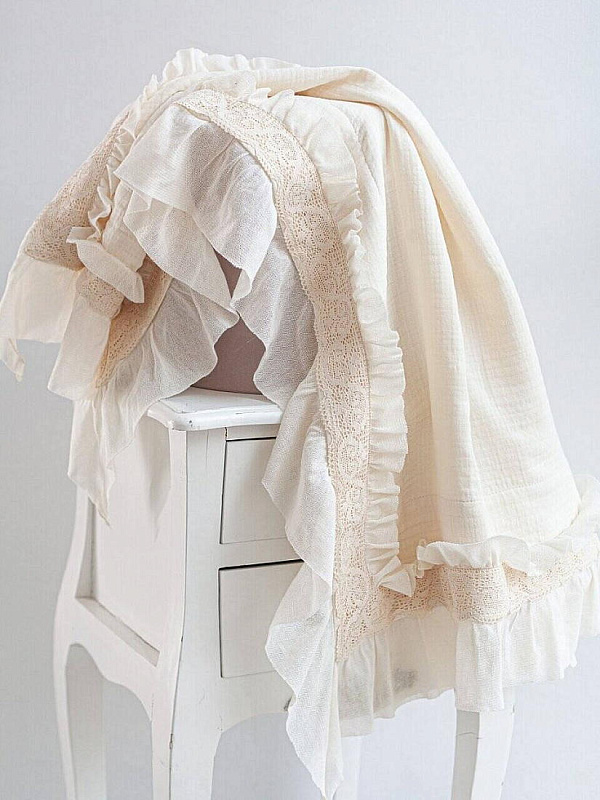 Муслиновый плед с рюшей из органического хлопка. Изысканный и невероятно красивый! Подарит вашему малышу чувство необычайной легкости, комфорта и безопасности! Идеальный вариант для выписки малыша из роддома в жаркое время года. В дальнейшем Вы сможете использовать такой плед, как плед для прогулок с малышом или хранить как семейную реликвию.