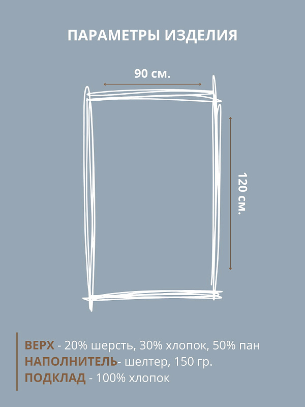 Материал изготовленияшерсть 20%, хлопок 30%, ПАН 50%, наполнитель шелтер 150гр, подкладка хлопок 100%