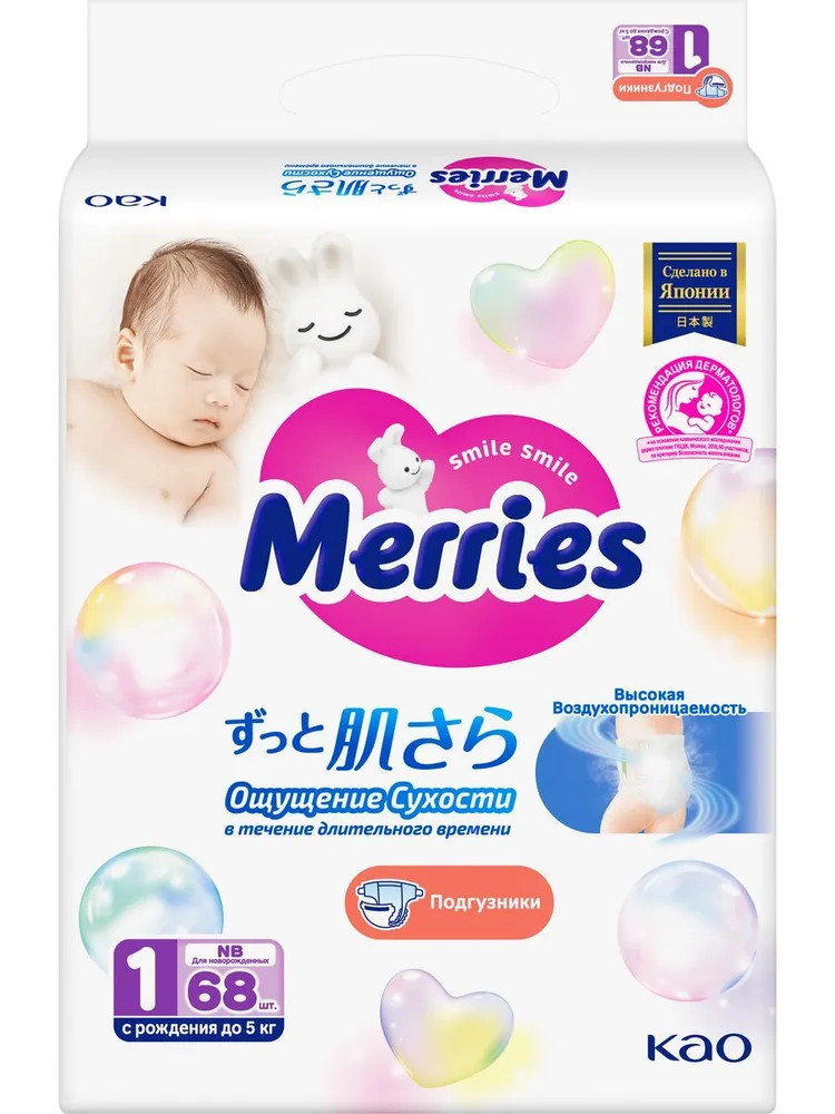 Подгузники для новорожденных Merries до 5 кг, 68 штНет оценокХарактеристики