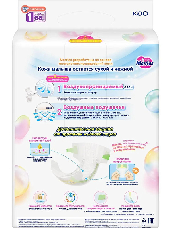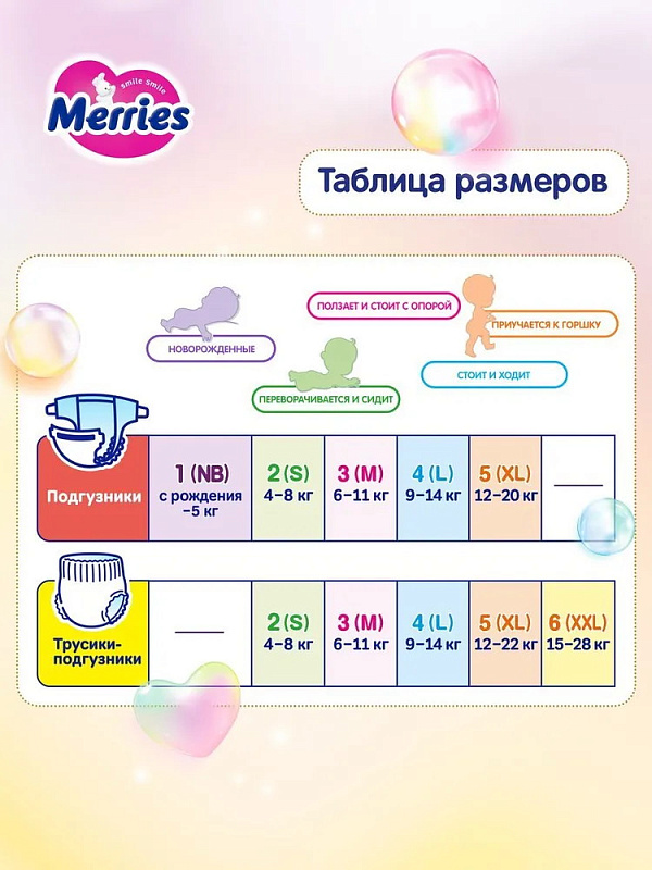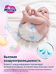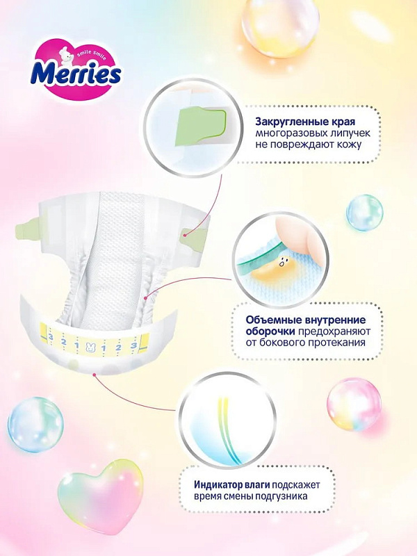 Детские одноразовые японские подгузники Merries (Меррис) для новорожденных малышей с весом до 5 кг (размер NB, 1) созданы с особенной заботой о коже и комфорте Вашего ребёнка. Merries – победитель премии «Марка №1 в России» в 2022 г. в категории «Подгузники и трусики для детей» и лучший бренд для малышей по признанию мам. Гипоаллергенные материалы, неощутимые на теле малыша, не вызывают раздражений, опрелостей и дискомфорта. Обновлённая технология трёх воздухопроницаемых слоёв сохраняет кожу малыша сухой и здоровой, обеспечивая свободное выведение прелого воздуха из подгузника. Полимерный абсорбент отлично впитывает большое количество жидкости, превращает её в гель и защищает от протеканий даже при значительном надавливании. Нежные воздушные подушечки внутреннего слоя теперь содержат в три раза больше воздуха в сравнении с предыдущим поколением подгузников Меррис. А волнистая бархатная поверхность уменьшает площадь соприкосновения подгузника с кожей, что особенно важно на этапе развития малыша, когда он больше лежит. Новый материал с увеличенными ячейками в центральной зоне подгузника моментально впитывает влагу и минимизирует её контакт с чувствительной кожей малыша. Мелкие ячейки по бокам волнистого слоя надёжно удерживают жидкий стул, который характерен в первые месяцы жизни, предотвращая его растекание по подгузнику. Внутренняя поверхность подгузника остаётся удивительно мягкой для кожи ребёнка и не прилипает к попке даже после того, как впитает большой объём жидкости. Трёхполосный индикатор наполнения легко проверить, не раздевая полностью малыша. Если полоски сменили цвет, подгузник пора заменить на новый. Впитывающий слой располагается по всей поверхности подгузника, поэтому жидкость не скапливается в одном месте, подгузник не сбивается в комок, не провисает и не стесняет движений малыша. Подгузники Merries подходят для девочек и для мальчиков. Не требуют использования защитных кремов и присыпок. Почти не заметны под одеждой и меняются бесшумно: вы не разбудите своего кроху шуршанием материала и фиксирующих липучек во время сна. Детские одноразовые подгузники Merries выпускаются во всех необходимых размерах и в нескольких вариантах комплектации. NB (размер 1, до 5 кг), S (размер 2, 4-8 кг), M (размер 3, 6-11 кг), L (размер 4, 9-14 кг). Все товары Merries разработаны в Японии с постоянным контролем качества производства и используемых материалов. Здоровье и комфорт для счастливых улыбок малышей и мам – это наши задачи и приоритеты непрерывного совершенствования качества продукции Merries.