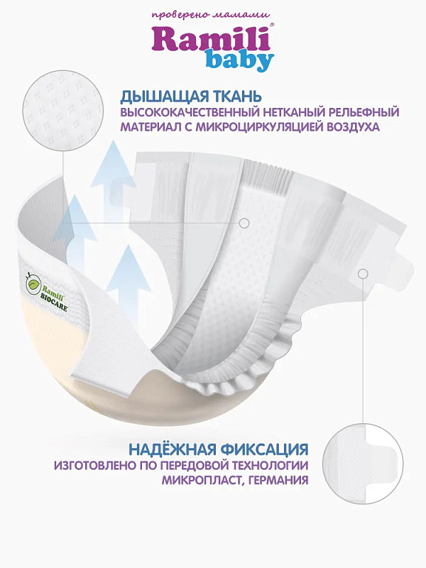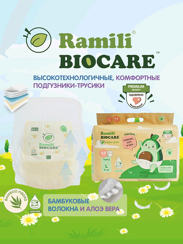 Подгузники-трусики Ramili Biocare — популярный выбор родителей по всему миру. Продукция бренда сочетает инновационные технологии, продуманный дизайн и безопасные материалы, обеспечивая ребёнку комфорт, а родителям — спокойствие.
