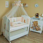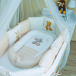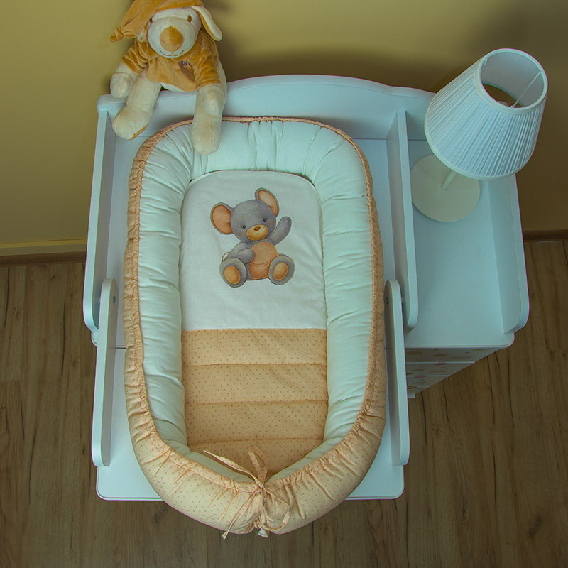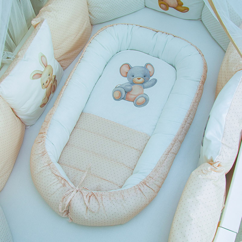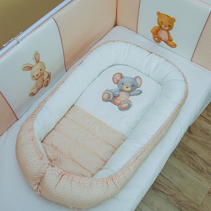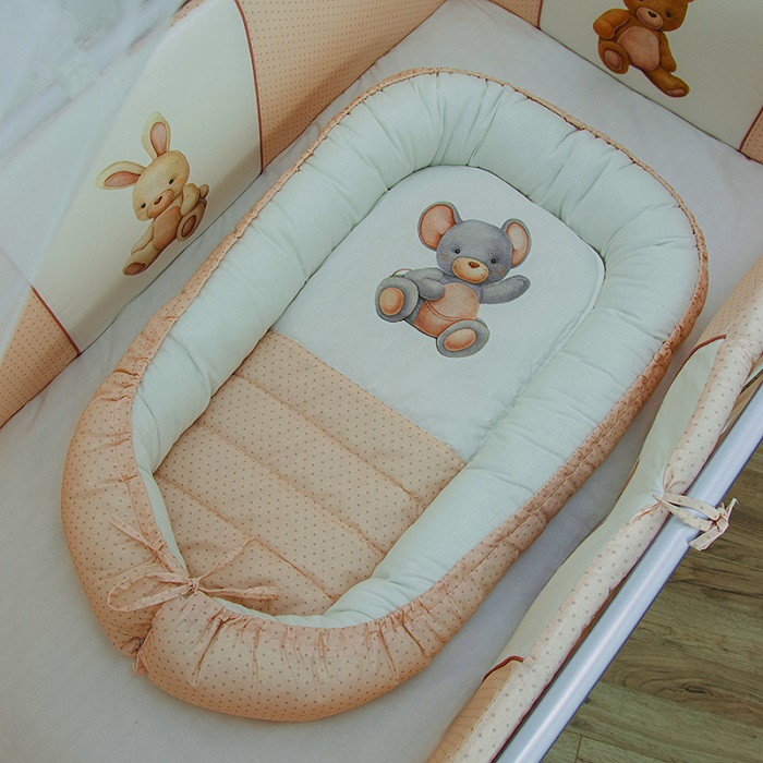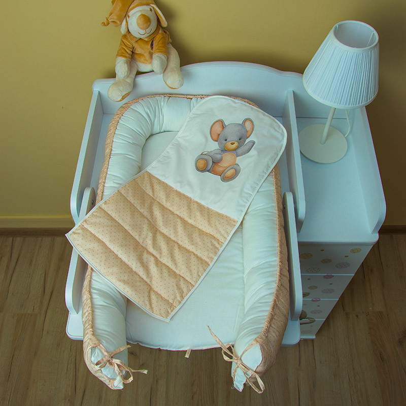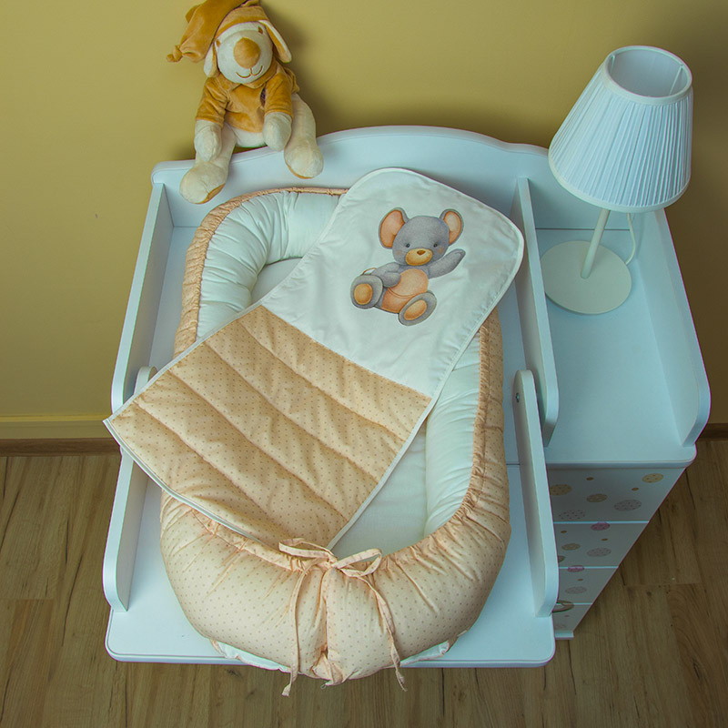Подушка-гнездышко Vikalex Мишкина Компания с матрасиком Мышка - это приятный и здоровый сон для вашего малыша. Подушка выполнена в бежевом цвете с гороховым принтом и рисунком Мышки на матрасике, дополнением служит милый бантик на ободке. Наша подушка-гнездышко сделана из качественных материалов, поэтому обеспечит младенца комфортом и уютом во время сна. Очень практична и удобна в использовании. Вы можете брать подушку с собой в путешествия, в гости, на прогулку, либо использовать её в других назначениях.