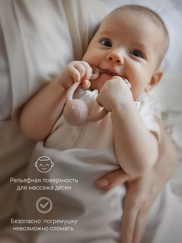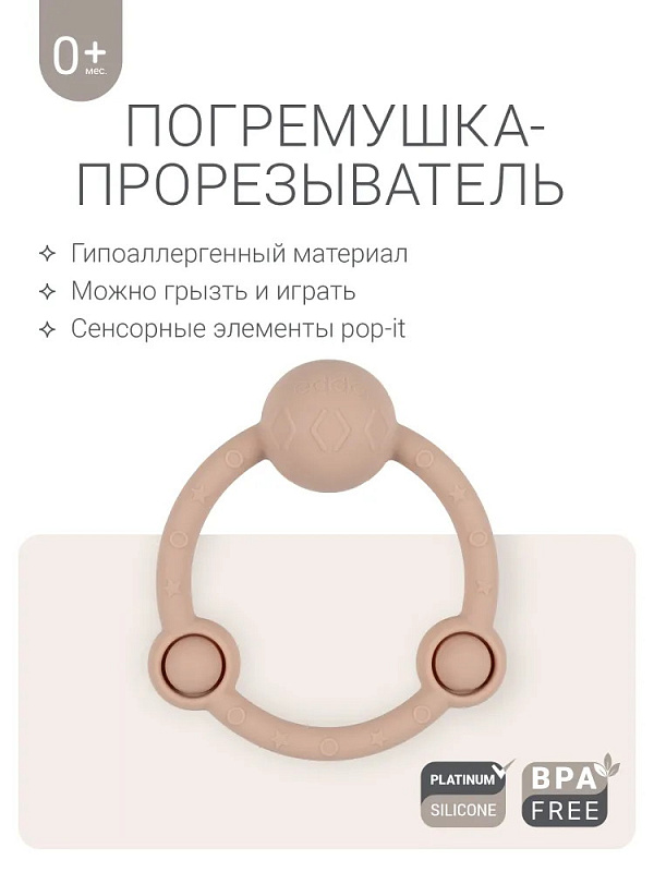 У лёгкой погремушки в виде кольца — эргономичная форма, которая идеально подходит для детских ладошек. Рельефная поверхность массирует дёсны при кусании, но не повреждает их, выполняя функцию прорезывателя. Игрушка развивает моторику и сенсорное восприятие, а элементы pop-it на погремушке-кольце делают игру с ней ещё увлекательнее. Погремушка из гипоаллергенного силикона издаёт успокаивающий звук и развивает ребенка через игру. Спокойные цвета игрушки гармонично впишутся в домашний интерьер.