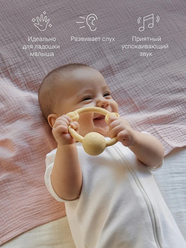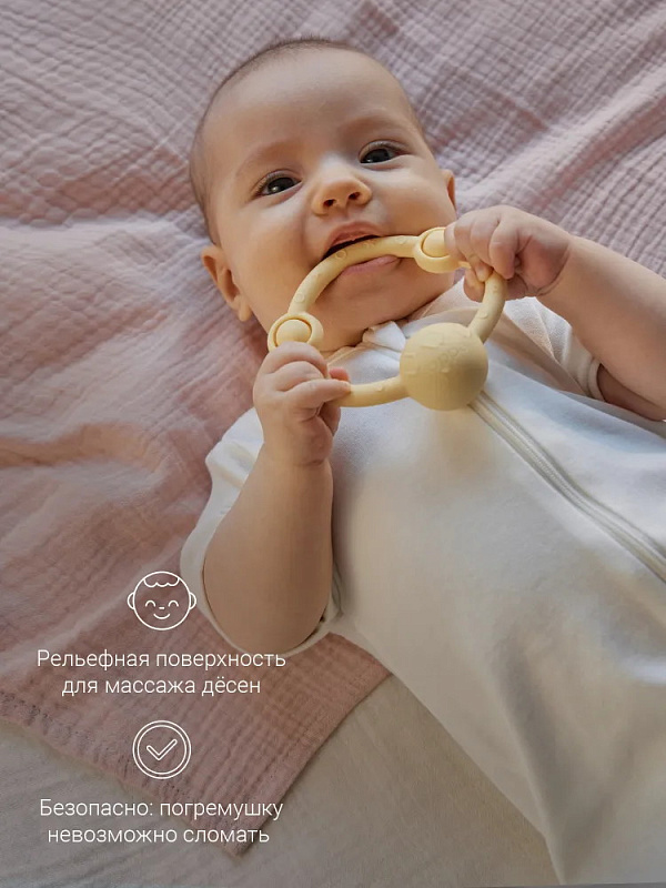 У лёгкой погремушки в виде кольца — эргономичная форма, которая идеально подходит для детских ладошек. Рельефная поверхность массирует дёсны при кусании, но не повреждает их, выполняя функцию прорезывателя. Игрушка развивает моторику и сенсорное восприятие, а элементы pop-it на погремушке-кольце делают игру с ней ещё увлекательнее. Погремушка из гипоаллергенного силикона издаёт успокаивающий звук и развивает ребенка через игру. Спокойные цвета игрушки гармонично впишутся в домашний интерьер.