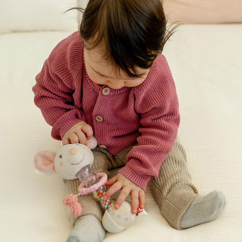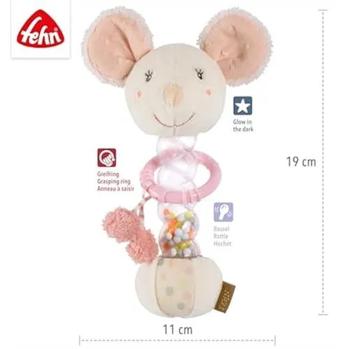 Нежная и милая погремушка-шейкер в виде мышки. Её удобно захватывать маленькими ручками и очень весело трясти, наблюдая за разноцветными бусинками внутри. При этом игрушка издаёт приятный звук. Светящиеся элементы помогают побороть страх темноты и успокаивают малыша перед сном.