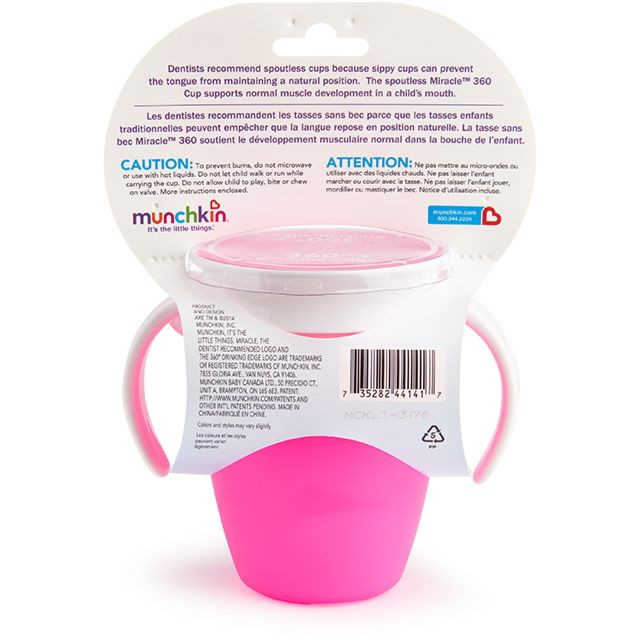 Поильник Munchkin MIRACLE® 360° создан с учетом потребностей как детей, так и родителей. Он предотвращает любые проливания напитка, а благодаря мягкому и гибкому материалу бережет зубы и десны малыша. Пить свой напиток малыш может по всей окружности - жидкость равномерно распределится под крышкой, под каким бы углом ребёнок не наклонил поильник. А еще поильник Munchkin MIRACLE® 360° помогает поддерживать нормальное развитие мышц во рту малыша. Никаких дополнительных носиком, соломинок и прочего, - поильник Munchkin MIRACLE® 360° прост в использовании и мытье. Из него можно пить сидя, на ходу и даже лежа! Поильник-непроливайка Munchkin создан специально для приучения малыша пить из взрослой чашки.