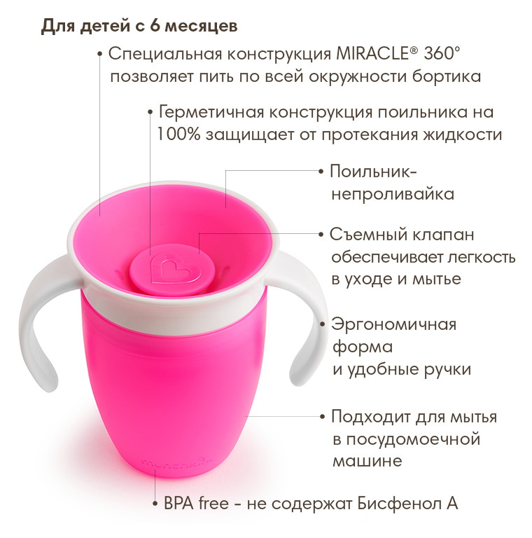 Поильник непроливайка Munchkin Miracle 360° с ручками 207 мл. с 6 мес. 12094/12272PK розовыйНет оценокХарактеристики