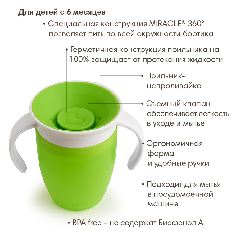 Поильник непроливайка Munchkin Miracle 360° с ручками 207 мл. с 6 мес. 12094/12443G зеленыйНет оценокХарактеристики