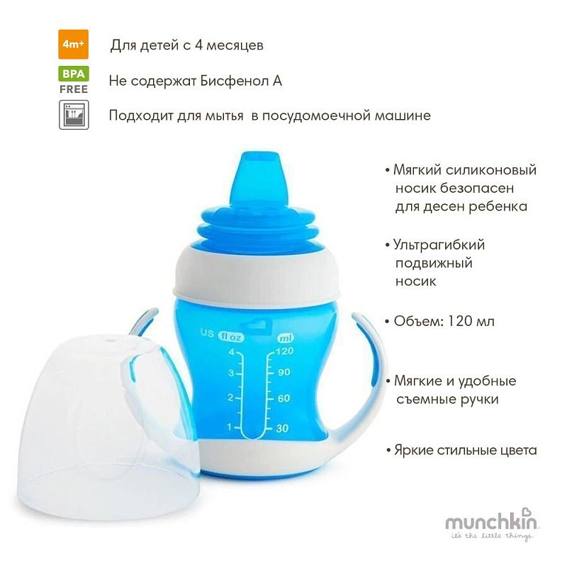 Поильник-чашка Munchkin Gentle обучающий, с ручками 4+ 120 мл. 11143/12549 голубойНет оценокХарактеристики