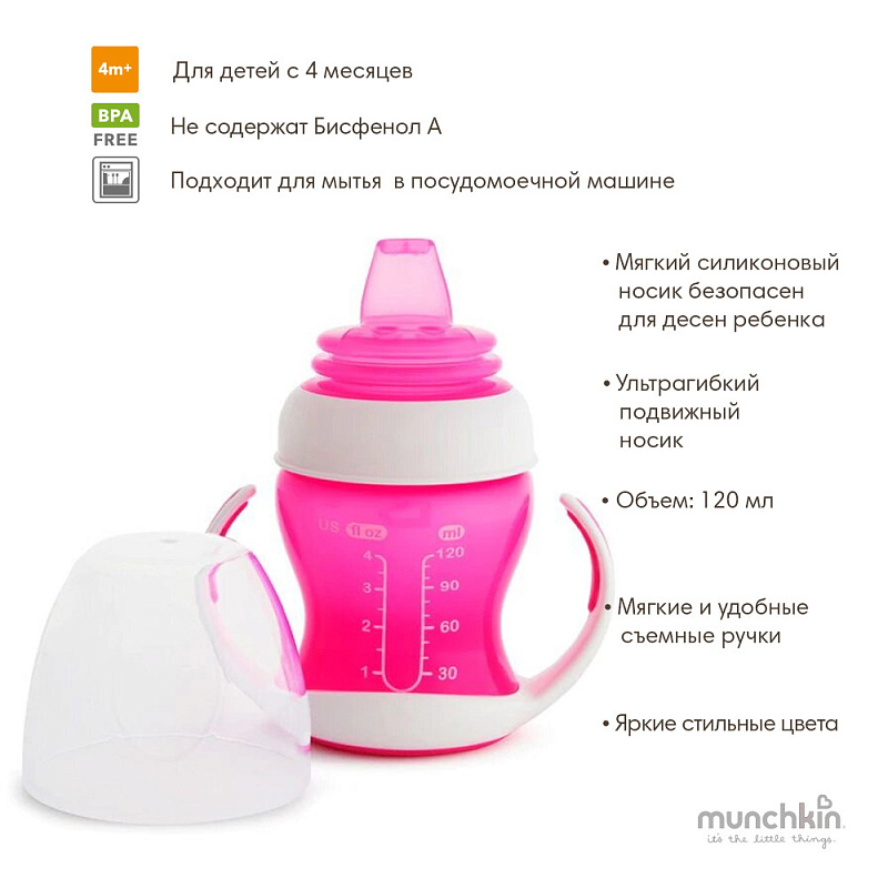 Поильник-чашка Munchkin Gentle обучающий, с ручками 4+ 120 мл. 11143/51786 розовыйНет оценокХарактеристики