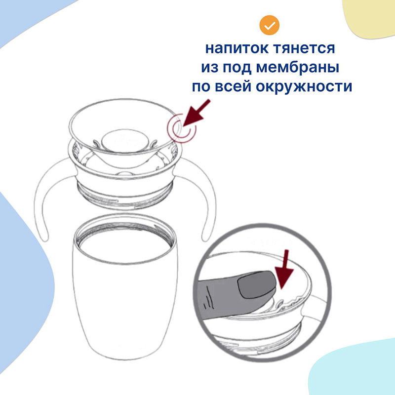 Конструкция носика позволяет пить малышу с любой стороны (360 ̊) по всей окружности, жидкость равномерно распределится под крышкой, под каким бы углом ребёнок не наклонил поильник. А силиконовая вставка внутри предотвращает любые проливания жидкости. Благодаря мягкому и гибкому материалу носика бережет зубы и десны малыша. Для удобства захвата поильник имеет две ручки. В комплекте с поильником идет крышка для защиты от протекания и загрязнения. Отлично подойдет для путешествий и прогулок.