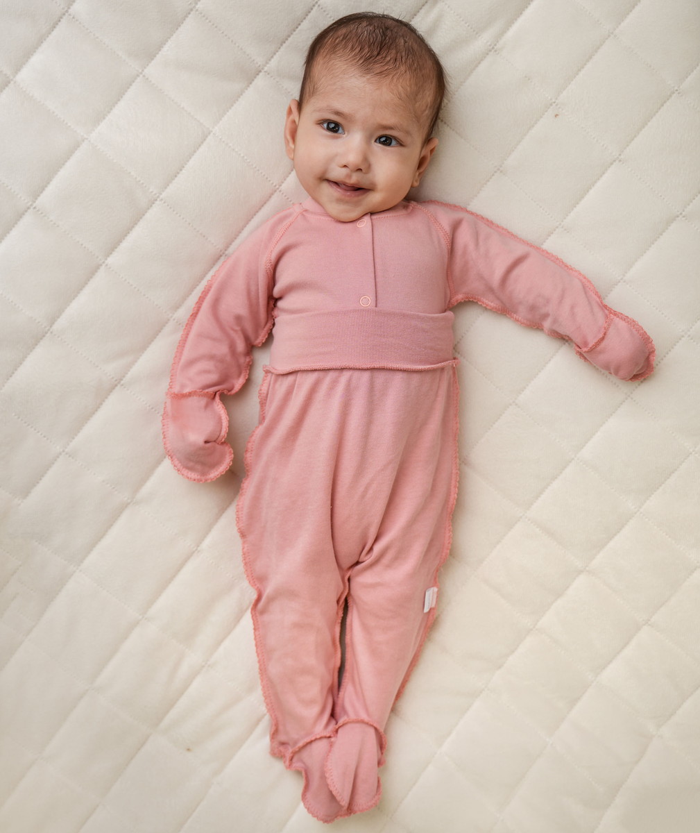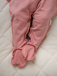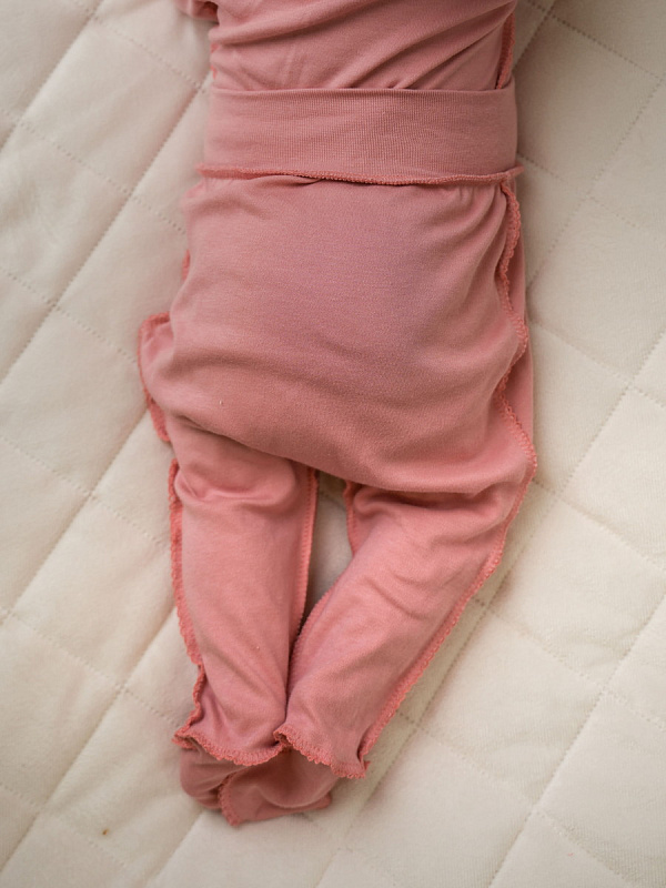 Ползунки на широкой резинке для новорожденного сшиты из однотонного интерлока швами наружу. Швы украшены отделкой "краше".