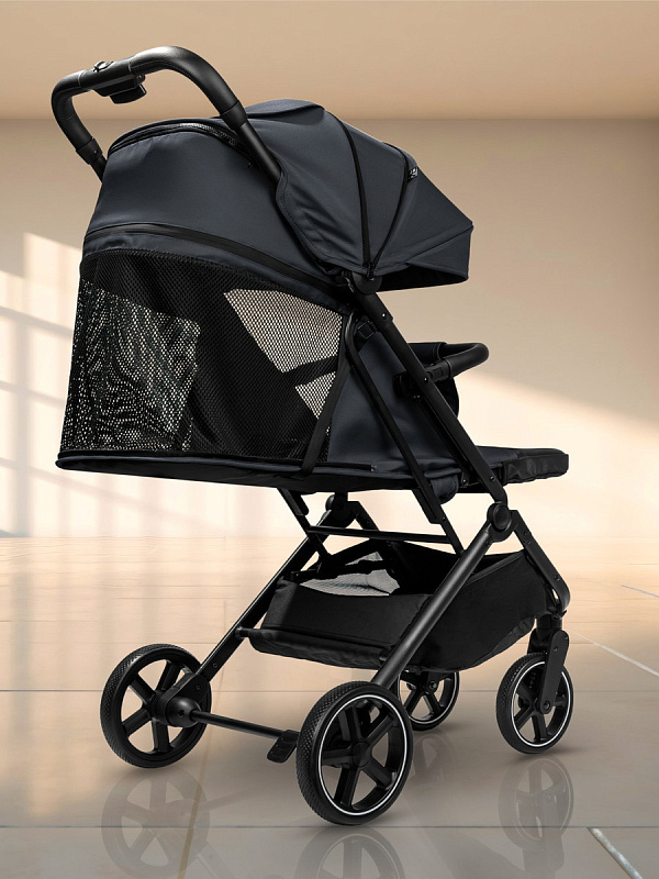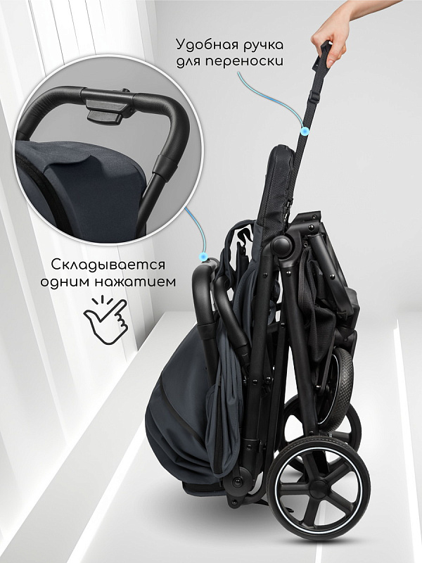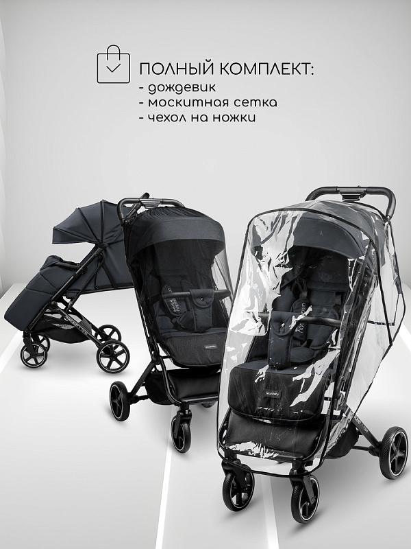 Для удобства переноски есть специальный ремешок, который позволяет вам легко взять коляску с собой. В комплекте с коляской идет теплый чехол на ножки, москитная сетка и дождевик.
