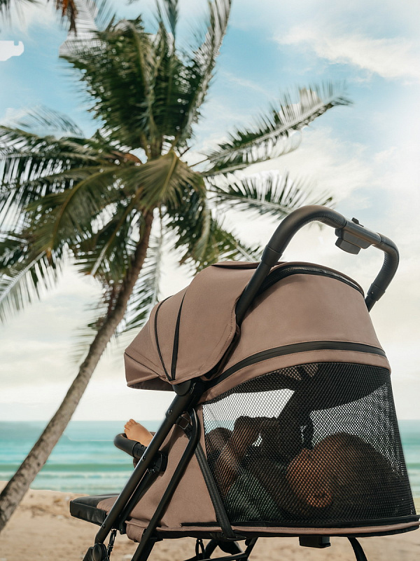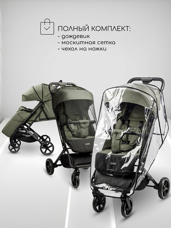 Для удобства переноски есть специальный ремешок, который позволяет вам легко взять коляску с собой. В комплекте с коляской идет теплый чехол на ножки, москитная сетка и дождевик.