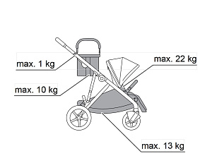 • Максимальная нагрузка на коляску, включая сиденье, люльку или автокресло, корзину для покупок и подстаканник не должен превышать 57,5 кг,