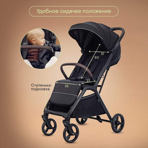 - Высокая спинка (50 см) и просторное сидение (35 см) обеспечивают вашему малышу необходимую поддержку, а глубина сидения (22 см) позволяет удобно устроиться во время долгих прогулок.