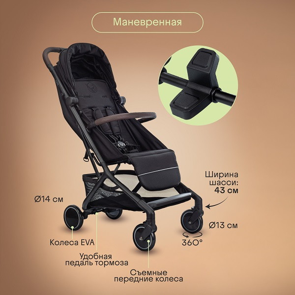 - Держатель для бутылочки всегда под рукой, чтобы вы могли легко утолить жажду вашего малыша во время прогулки. А передние колеса диаметром 13 см и задние 14 см обеспечивают маневренность и легкость передвижения по любым поверхностям.