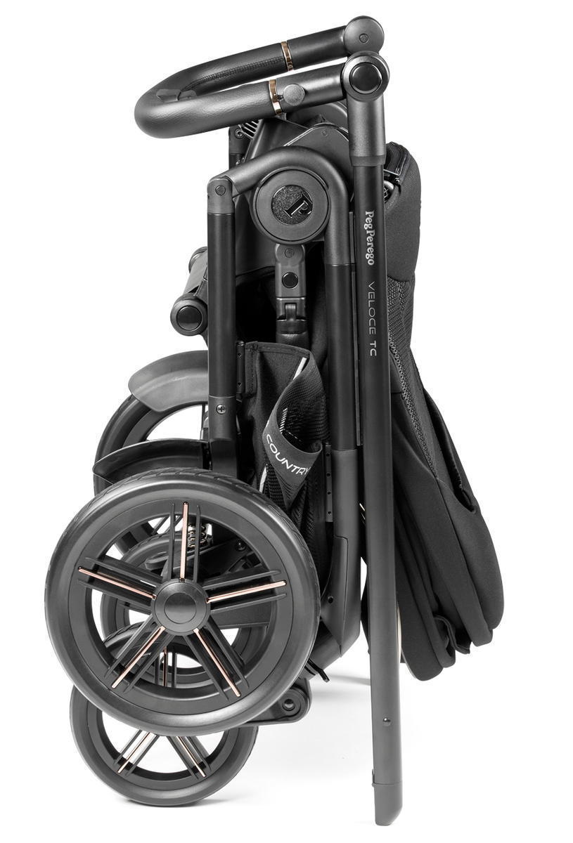 Прогулочная коляска Veloce TC складывается и раскладывается всего одной рукой с помощью специальной централизованной системы складывания, расположенной на ручке. В сложенном виде занимает очень мало места, и сама стоит без опоры, не пачкая ручку и тканевую обивку.