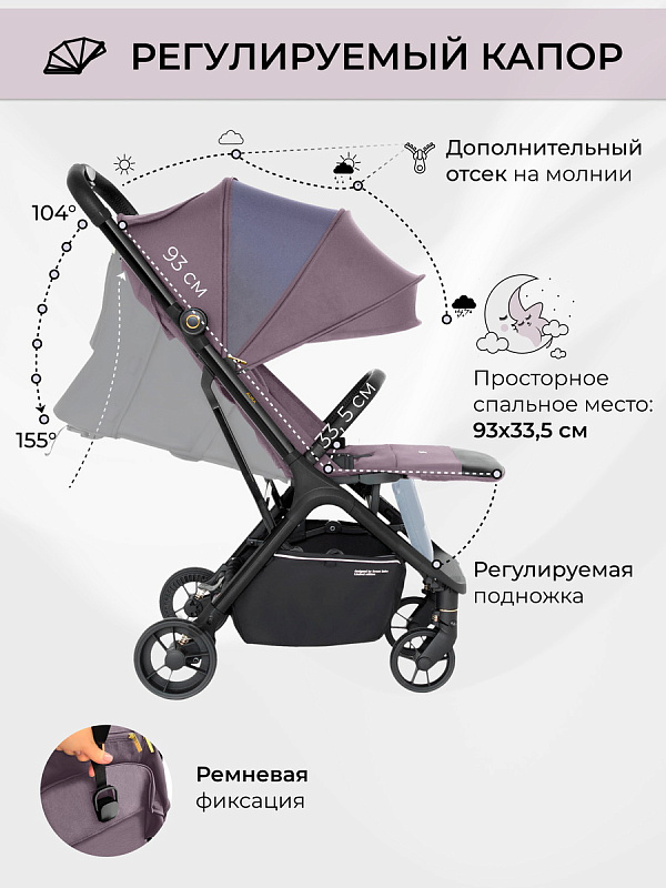 - Глубокий регулируемый капюшон с сеткой защищает от солнца и ветра, позволяя вашему ребенку наслаждаться спокойным сном в любых условиях.