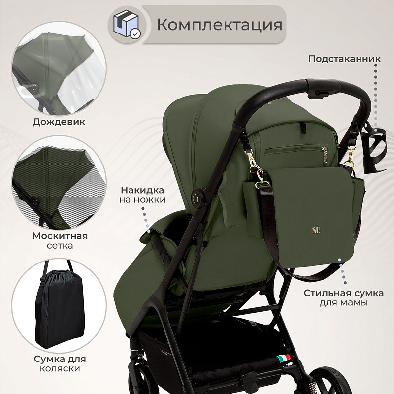 Богатая комплектация: В комплекте вы найдете все необходимое: накидку на ножки, москитную сетку, дождевик, сумку для коляски и супер-сумку для мамы, а также подстаканник для вашего любимого напитка — теперь прогулки станут еще более комфортными и приятными!