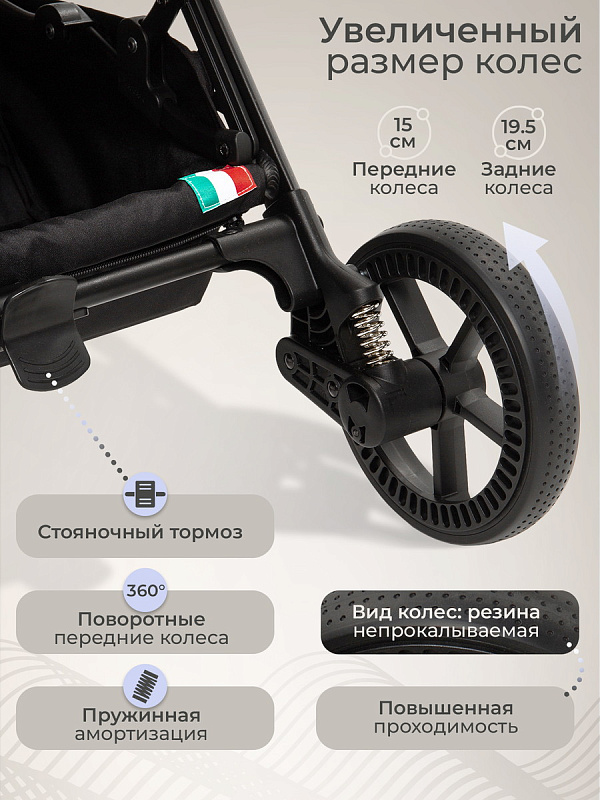 Передвижение по любым поверхностям: с увеличенными колесами (передние 15 см, задние 19,5 см) вы сможете легко и комфортно гулять даже по сложным маршрутам. Плавный ход и отличная устойчивость — вот что делает Aura Plus идеальной для всесезонных прогулок!