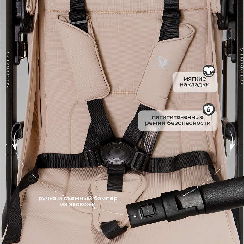 - Пятиточечные ремни безопасности с мягкими накладками гарантируют надежную фиксацию во время прогулок.