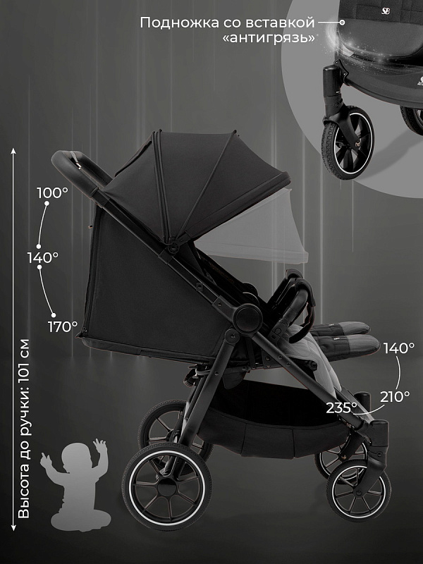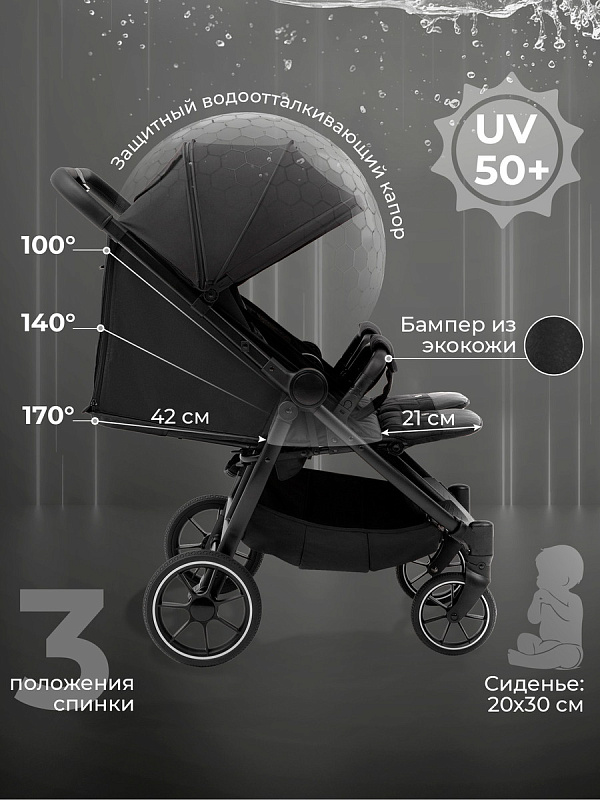 2 глубоких регулируемых капора из водонепроницаемой ткани с пропиткой UV50+ опускаются до самого бампера. 2 накидки на ножки укроют малышей от непогоды и создадут дополнительный уют в холодное время года.
