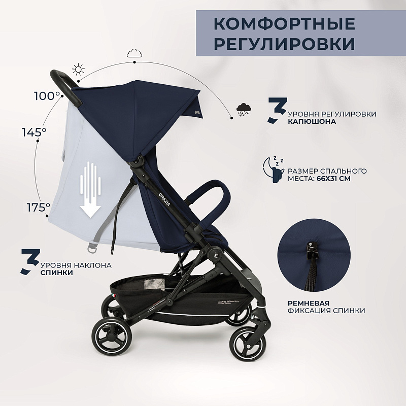 Удобный наплечный ремень для переноски коляски в сложенном виде;