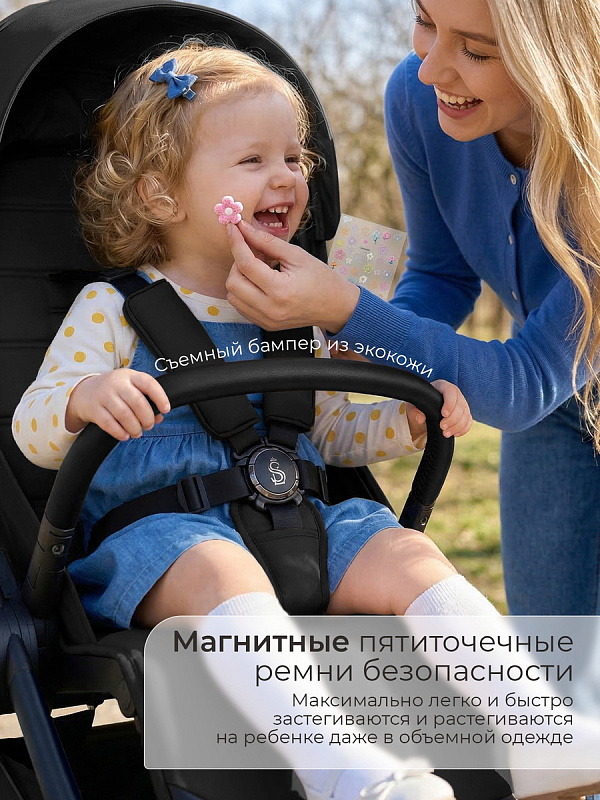 - Пятиточечные магнитные ремни с мягкими накладками и съемный поворотный бампер для быстрой и легкой посадки;