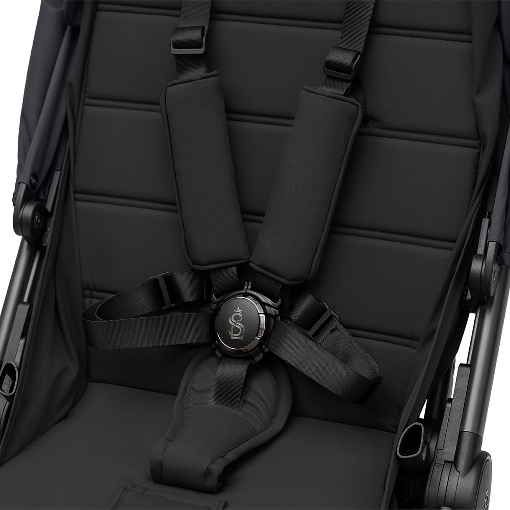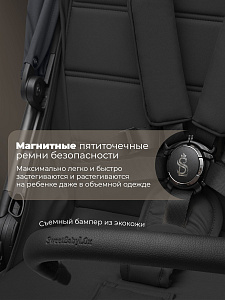 - Пятиточечные магнитные ремни с мягкими накладками и съемный поворотный бампер для быстрой и легкой посадки;