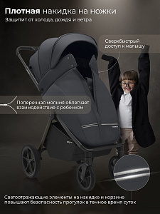 - Водоотталкивающая ткань капора защищает от ультрафиолетовых лучей и непогоды, а накидка на ножки - распашонка с легким доступом к ребенку – от ветра и холода;