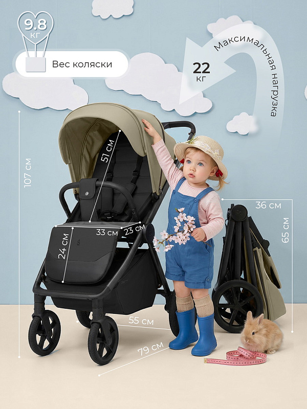 - Коляска складывается одним движением тканью вовнутрь;